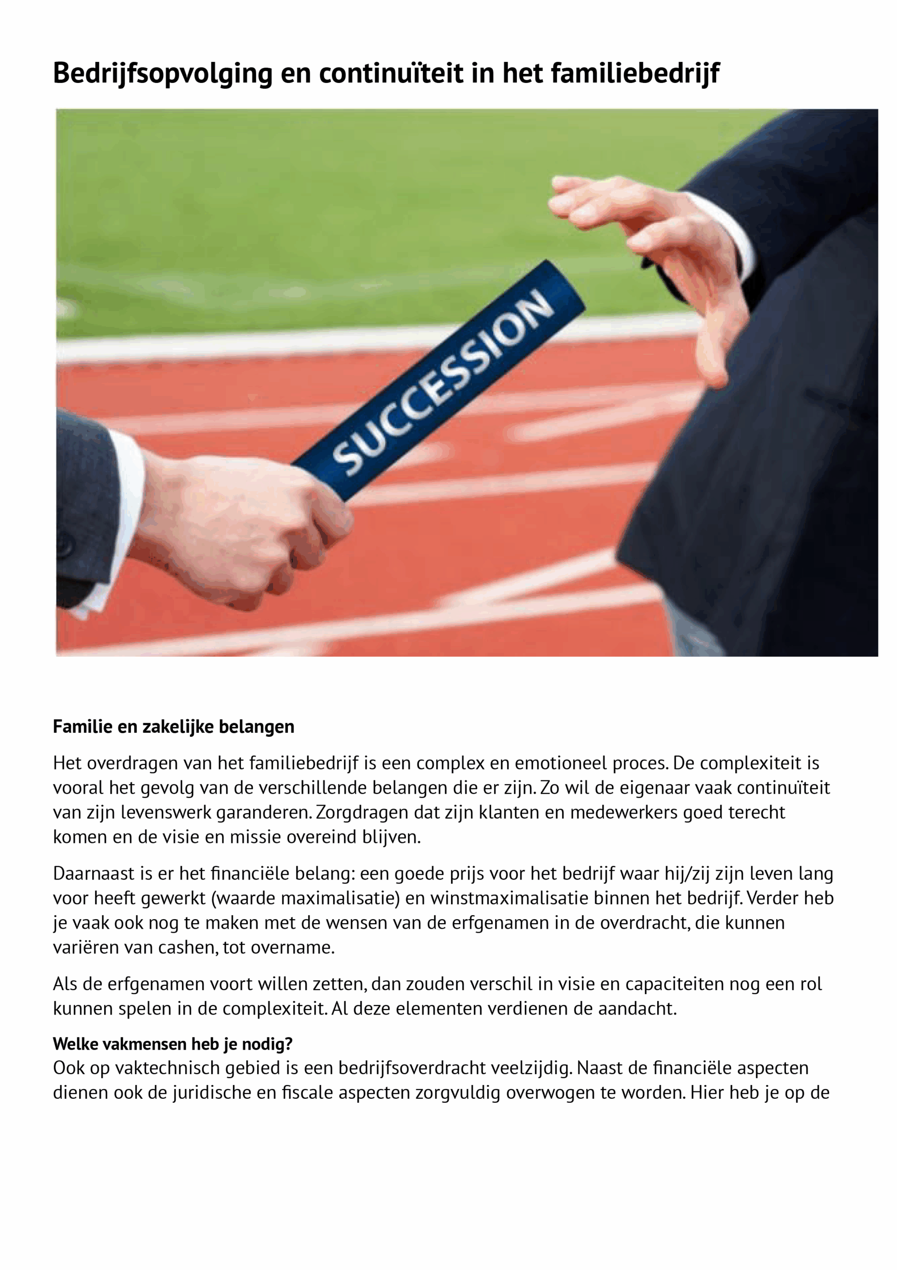 Het overdragen van het familiebedrijf is een complex en emotioneel proces. De complexiteit is vooral het gevolg van de verschillende belangen die er zijn. Zo wil de eigenaar vaak continuïteit van zijn levenswerk garanderen. Zorgdragen dat zijn klanten en medewerkers goed terecht komen en de visie en missie overeind blijven.
